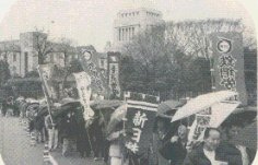 Her voice against the constitutional revision reverberated the hall.- LDP MPs could only defend their position with a cheap logic: 'If Japan should meet an attack, how to do?' - 'Really needed is to make an opposition movement against military build-ups by the governments in solidarity with the people across the world'. - Controversies heated up also over the coercive 'Wiretapping Law' among MPs and invited students including the gallery with the impetus of her challenging intervention. No to subcritical nuclear tests! Zengakuren waged a protest at the gate of the US Embassy in Tokyo (7 April) (Photo section 4-5) [3] Smash a new 'Democratization League [Mindo]'! Full quotation from the relevant doccuments. - View of the General Federation of Japan Railway Trade Unions on a new 'Democratization League' - The concerned Joint Statement for 'Democratizing' East Japan Railway issued by three trade unions (JR Trade Union Confederation-East Japan Railway Industry Trade Union, JR Trade Union Confederation-JR Green Union, National Railway Workers Union-East Japan Chapter). [4-5] For the coming joint action of workers and students on 29 April Smash the Constitutional revision by the Mori administration! Smash building of a war readiness order for aggression! Denounce the official leadership of SDPJ / JCP immersed in election campaigns! Fight back by transcending their parliamentarianist distortion!