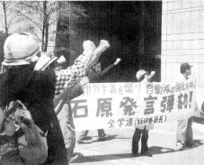 Denounce the Ishihara remarks! Condemn his ultra-nationalist, exclusionist agitation and reference to the mobilization of SDF troops for 'law and order'! Smash the constitutional revision! Smash the Mori administration's scheme to build a national mobilization system! -