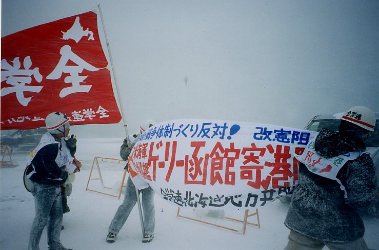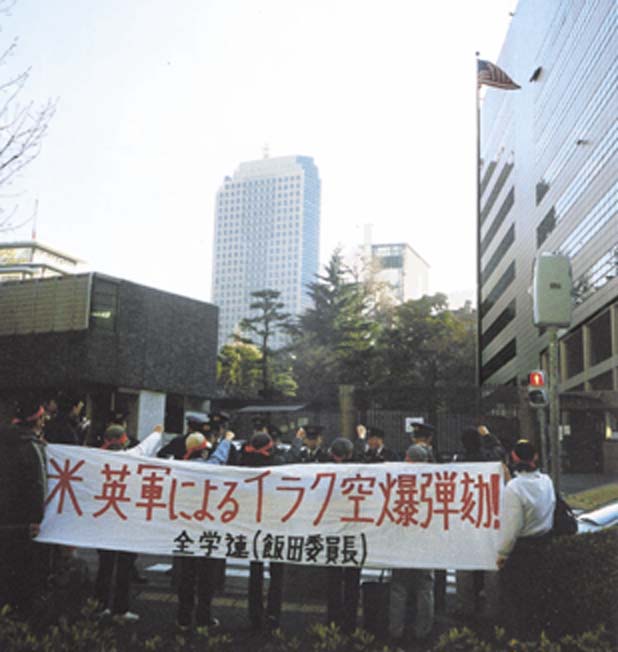 the Ehime Maru!![]() Now is the time to overthrow the incompetent, shameless Mori Cabinet! - A big tragedy caused by a 'show' for promoting mass military build-ups - The Mori cabinet sunk with its failure over the sub collision - Intensifying struggles for power after Mori - Oppositions within the conservative political elite over revision of the Constitution - The official SDPJ / JCP leadership immersed in their policy promotions for the coming election - Oppose the Security Treaty! Advance to overthrow the Mori cabinet! Denounce imperialist US and Britain airstriking Iraq! Never allow the war arsonists! - Zengakuren students wage their protests at the US Embassy (Photo right) [2] No USS port-calls! Zengakuren Hokkaido fights together with militant workers 3 Feb, Hakodate: Stop the US frigate! Zengakuren students fight despite the blizzard before encouraging a local Rengo rally against the port-call together with militant workers 7 Feb, Tomakomai: Militant students fight to block the flagship of the US Seventh Fleet, lead a trade-union-sponsored rally together with militant workers 30 Jan, Obihiro: Students from Obihiro University of Agriculture and Veterinary Medicine protest against a US military jet landing at a civilian airport 10 Feb., Osaka: Zengakuren Kansai protest against the nuclear sub collision at the US Consulate 29 Jan., Nagoya: No KSD bribery scam! Down with the Mori cabinet! Zengakuren students protest against the LDP Prefectural office Surging protests against a series of crimes by US troops 12-17 Jan., Okinawa: Militant students lead the struggles