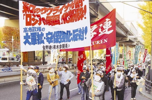 (pic above right) 'Smash Russia's aggression against Ukraine!' White-helmeted militants marching on the Russian embassy, raising their fists with anger [6] Anti-war, anti-fascist demonstrations across the country October 19th The united action by workers and students in Osaka Anger flares up against Osaka-based right-wing Ishin, now part of a ruling coalition
