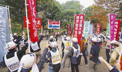 'Anti-war, anti-fascism!': solidarity rally (pic above right) Angry protesters clenched their fists at the LDP office The united action by workers and students in Nagoya Smash the reactionary offensives launched by the far-right Takaichi government!