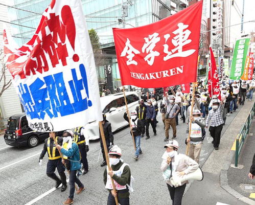 この闘争の直前に、アメリカ帝国主義とイスラエルはイラン経済の心臓部たるカーグ島への爆撃を強行するとともに、閣僚や軍幹部を相次いで爆殺するテロルに狂奔していた。米・イスラエルの権力者どもが二月二十八日に指導部の一挙的爆殺という先制攻撃をもって開始したイラン軍事侵略こそは、「反米・反シオニズム」を掲げたシーア派宗教国家イランを暴力的に破壊することを狙った、今ヒトラーどもの世界史的暴虐にほかならない。全学連はこれを絶対に打ち砕くという決意をみなぎらせ断固としてたたかいぬいたのだ。 全学連は本闘争を、侵略の指揮官トランプと首相・高市との日米首脳会談を目前にした局面でたたかった。トランプは、唯一の「属国」日本の首相・高市を「日米安保の鎖」でしめあげながら、自衛隊をペルシャ湾に引きずりだそうと躍起になっていた。このトランプの要請に応えてペルシャ湾への出兵へ、さらには憲法第九条の改悪へと、参戦国家の道を突き進もうとしているのが高市政権にほかならない。イラン軍事侵略への日本国軍出兵=参戦に踏みだそうとする高市政権にたいする怒りに燃えて、たたかう学生たちは断固たる決意でたちあがったのだ。 同時に、全学連のたたかう学生は、五年目に突入したプーチン・ロシアのウクライナ侵略戦争を粉砕するためにロシア大使館に怒りの巨弾をぶちこんだ。 全学連は、イラン侵略戦争に狂奔するトランプやネタニヤフにたいして「国際法の遵守」を求める運動へと闘いをおし歪める日本共産党・志位=田村指導部を弾劾したたかった。職場深部からイラン反戦の闘いを組織している戦闘的・革命的労働者とあい固く連帯して、断固たるデモンストレーションをぶちぬいたのである。 全国の学生が米大使館・首相官邸に進撃 午後二時、全学連の白ヘル部隊は港区三河台公園からデモ行進にうってでた。 デモ隊は「米帝・イスラエルのイラン侵略粉砕! 日本国軍の中東出兵阻止!」と書かれた横断幕を先頭に掲げ、その後ろに真紅の全学連旗を翻す。「侵略粉砕! 出兵阻止!」かけ声を轟かせながら、学生たちは大学旗を手に力強く進撃する。 デモ隊がさしかかった飯倉片町交差点の先にロシア大使館がある。司会の学生が怒りに燃えて呼びかけた。「ウクライナへの軍事攻撃を激化させ人民を殺戮するプーチン政権に、満腔の怒りを叩きつけよう!」 デモ隊はいっせいにシュプレヒコールをあげる。 「<プーチンの戦争>を打ち砕くぞ!」「ウクライナ全土空爆弾劾!」「占領地での拷問・虐殺弾劾!」「ウクライナ人民と連帯してたたかうぞ!」 デモ隊はさらに六本木通りを北進する。マイクを握った全学連東海地方共闘会議の学生は、米・イスラエルのイラン侵略を徹底的に弾劾した。つづいて九州地方共闘会議の学生が、日本国軍のホルムズ海峡派兵を絶対に阻止する決意を決然と表明した。部隊の士気はますます高まる。 デモ隊が溜池交差点に入った。左手にあるのが首相官邸だ。いままさにワシントンで侵略の指揮官たるトランプとの会談に臨もうとしている首相・高市。この高市がイラン侵略を強行するトランプ政権にどこまでも隷従しようとしていることへの煮えたぎる怒りを、学生たちは断固として叩きつけた。 「日本国軍の出兵阻止!」「イラン侵略への参戦を許さないぞ!」「侵略戦争法撤廃!」「日米首脳会談反対!」 白ヘル部隊はさらに外堀通りをぐいぐい突き進む。そこに、機動隊車両に守られたアメリカ大使館が姿をあらわした。いまこの瞬間にも、イスラエルのシオニストとともにイラン全土を猛空爆し人民を殺戮している軍国主義帝国アメリカ。その出先機関たる米大使館に翻る巨大な星条旗を眼前にして、白ヘル部隊の怒りは頂点に達した。 「アメリカのイラン軍事侵略粉砕!」「強盗帝国主義の暴虐を許さないぞ!」「在日米軍の出撃阻止!」「安保粉砕!」「中洋人民は反米・反シオニズムの闘いを巻き起こせ!」 学生たちはあらん限りの力をこめて米大使館に怒りの拳を叩きつけた。 デモ隊はさらに霞が関に進撃し、左手にある国会に怒りの拳を叩きつけた。 「憲法九条改悪阻止!」「長射程ミサイルの配備反対!」「国家情報局の創設反対!」「高市政権を打倒するぞ!」 こうしてたたかう学生たちは、警察権力・機動隊に一指も触れさせることなく、日比谷公園まで戦闘的デモを貫徹したのである。 軍国主義帝国の暴虐を打ち砕け! ――決起集会 午後一時、デモに先立って、全国から結集した闘う学生たちは三河台公園で決起集会をおこなった。 集会のはじめに基調提起にたった有木全学連委員長は、冒頭から怒りに満ちたアジテーションをくりひろげた。 「アメリカ帝国主義とイスラエルによるイラン軍事侵略を断固として打ち砕け! 米・イスラエルは反米シーア派国家イランにたいする野蛮きわまる先制攻撃を強行し、政府中枢・軍幹部ら四十名以上を爆殺した。イラン国家を転覆せんとする米帝とイスラエルの暴虐を許すな!