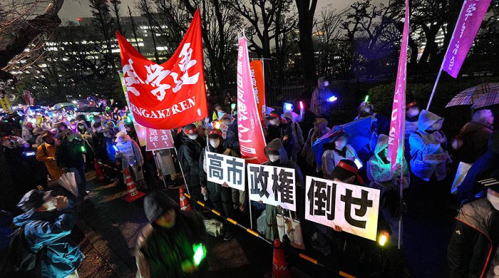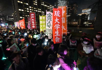 まさにその十九日に、総がかり行動実行委と9条改憲NO! 全国市民アクションとが主催した「イラン攻撃許さない! 緊急アクション」(「十九日行動」)が、衆議院第二議員会館前を中心にしておこなわれた。イラン攻撃への危機感をいだく一万一〇〇〇人の労働者・人民が結集し、国会を囲むように議員会館や国会図書館の前を埋めつくした。万余の参加者は、「アメリカのイラン攻撃反対! ホルムズ海峡への自衛隊派兵反対!」の声を首都中枢に轟かせた。 たたかう学生たちは、その最先頭で、「イラン攻撃粉砕! 日本国軍の出兵阻止」の旗を高く掲げてたたかった。革命的・戦闘的労働者たちは、イラン戦争反対の論議を創造し、組合や職場の仲間たちとともに集会に参加した。 わが同盟情宣隊は、参加者に革マル派の革命的な檄を飛ばした。わが同志たちは、地下鉄永田町駅と国会議事堂前駅の二ヵ所において、「米帝・イスラエルのイラン軍事侵略粉砕!」と大書したビラを集会参加者に隈なく配布したのだ。 「革マル派です」という力強い声に応えて、通りすぎた足を戻してビラを受け取る労働者。集会参加が初めてという若い女性は、ビラを受け取ると、「日本(の労働者)がまともなことをみせないと」と毅然として応える。わが同盟の檄は参加者たちに共感をもって受けとめられたのだ。 午後六時半に集会が開始された。開始後もなお参加者の列は途切れることなく続き、議員会館前、国会図書館前だけではなく、警察権力の規制を破って国会裏にも参加者が並んだ。 集会の冒頭の「コール」や主催者の挨拶で「イラン攻撃絶対反対」が叫ばれ、参加者がこれに呼応する。その参加者の圧倒的な部分を占めたのが、若い労働者・学生・市民たちだ。 自治労や日教組などの組合の旗のもとに結集した労働者たち。さらには、SNSでの呼びかけに応えて参加した労働者・市民たち。二十歳・三十歳台を中心とした彼らは、イラン戦争という現在の歴史的な局面において、イラン攻撃と自衛隊派兵への危機感を燃やして参加したのだ。手に手に赤・青・緑・黄など色とりどりのペンライトを持った参加者たちは、それをいっせいに打ち振って、イラン攻撃反対・日本の派兵反対の声をあげたのである。 集会では社民党やピースボートの代表などが挨拶にたった。日共の参院議員・山添拓ものこのこと登場した。山添は、「いま一番やるべきことは、アメリカにたいして攻撃やめろと求めることだ」などと、トランプへの請願を口にした。そして、「対話の外交によって戦争を止めるために声をあげよう」とほざいたのだ。戦争狂トランプに、「戦争ではなく対話」を求めるなどと言うのは、きわめて犯罪的な主張でしかない。危機感をもって結集した労働者・人民から完全にかけはなれた姿をさらしたのが、日共官僚にほかならなかった。 こうしたなかで、集会の最先頭で奮闘したのがたたかう学生たちだ。 全国から学生が怒りに燃えて決起