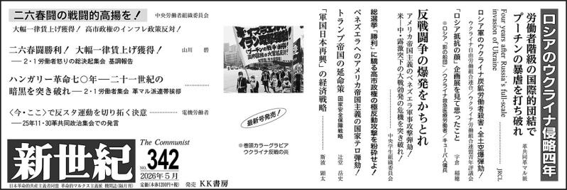 最新号紹介 暗黒の二十一世紀を覆せ 反戦闘争の爆発を! ウクライナ侵略四年 <プーチンの戦争>粉砕! アメリカとイスラエルはイランとの「核協議」を利用しイランを騙して先制攻撃をしかけ、最高指導者ハメネイや軍・政府幹部を一挙に爆殺した(二月二十八日)。核軍事大国のアメリカが反米のシーア派国家イランを転覆することを狙って、最新鋭の兵器を総動員して襲いかかったのだ。国連も国際法もいっさい無視したこの暴虐を、トランプとネタニヤフは「神」の名において正当化しさえしている。この悪逆無道の侵略を断じて許すな。 イランの「徹底抗戦」を掲げた反撃に直面したトランプは、NATO諸国や日本に参戦を要求した。この要求に唯一応えて日本国軍をホルムズ海峡に派兵しようとしているのが高市だ。ネオ・ファシスト高市政権による日本の参戦を絶対に阻止せよ!「安保法制」=戦争法撤廃! 改憲阻止! 安保破棄めざしてたたかおう! イラン反戦・反安保・反高市政権の闘いに起ちあがっているすべての諸君に、『新世紀』第三四二号を贈る。 ◆核をもつ大国が自国に逆らう中小国を力でねじふせる「弱肉強食の時代」、この暗黒化の深まる時代への転回点となったのがロシアのウクライナ侵略であった。この蛮行の開始から四年に際して、わが同盟が発した声明「労働者階級の国際的団結でプーチンの暴虐を打ち破れ」を巻頭に掲載した。 ウクライナの人民はいま、侵略者プーチンの要求をトランプがほぼ丸呑みした「和平案」をつきつけられている。同時に、ロシア軍による連日の電力インフラや学校・病院などへの攻撃にさらされている。この困難な局面のもとでもウクライナの人民は、労働組合や様ざまなコミュニティーに結集して不屈にたたかっている。彼らと固く連帯してたたかおうと声明は訴える。 またロシアの人民にたいしても、プーチンをいただく「FSB強権型支配体制の打倒をめざして前進せよ」と呼びかける。スターリンの末裔である今日のロシア支配層の出生の秘密をも暴きだしつつ。 声明は、呼びかける。「世界はいま、米・中・露の核大国が、力で己れの勢力圏を排他的に拡張する時代に突入した。」「暗黒の二十一世紀の闇は深い。だが、資本主義の終わりはすでに始まっている。」「この『終わりの始まり』を『現実の終わり』に転化」せよ。これがプロレタリアートの歴史的使命なのである、と。 またロシア軍による炭鉱労働者殺害・全土空爆を弾劾するウクライナ労組の声明も掲載した。