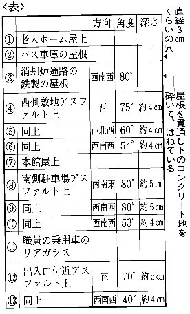 @すさまじい破壊力 まず驚かされたのは、そのすさまじい破壊力である。アスファルト地面には直径二センチメートル深さ四〜五センチメートルにおよぶ着弾痕が八つ残されていた。また渡り廊下の鉄製屋根は、二センチメートルほどの丸い穴があき、真下のコンクリート地面を穿(うが)っているのだ。「直撃されていたら確実に死んでいた」という福祉施設関係者の証言は、まさに実感そのものなのである。 そもそも、空自が発表しマスコミがそれをうのみにして報道している「訓練弾」なる表現は、人民をたぶらかすためにデッチあげたものである。20ミリ機関砲弾は、たとえ火薬をつめていなくても強力な殺傷力をもっていることは明らかなのだ。たとえば、陸自が使用する12・7ミリ機関銃は、火薬をつめない鋼鉄製の弾を発射するものであるが、それをはるかに上回る殺傷力をもっているのであって、じっさい、空自は「普通弾」と呼称しているのであって、「訓練弾」などと呼称していることじたいが欺瞞なのだ。 A砲弾の入射角、方角 われわれが福祉施設敷地内で確認し、計測した砲弾痕は、九ヵ所である。(表、図1を参照) (イ)方角について 砲弾痕の計測から、およそ西方向から飛んできたと推定できるものが七ヵ所(番号B〜E、H、I、L――Aグループとする)である。 他方、この七ヵ所とは方角が明らかに異なるものが二ヵ所あった(GとK――Bグループとする)。これは、およそ南方面から飛んできたと推定できるものであり、Aグループの入ってきた方角とは異なる。なかでも、DとGとでは、なんと一五〇度もちがうのである。このことは、砲撃が二機でおこなわれたことをしめすものにほかならない。 (ロ)入射角について 個々の弾痕の入射角は表のとおりである。Aグループは、それぞれ入射角はまちまちであり、最大八〇度(B)から約四〇度のものまである。Bグループは、2ヵ所だけであるが、いずれも約七〇度(K)と約八〇度(G)と、入射角がAグループのものと比べてやや高い。とまれ、Aグループにせよ、Bグループにせよ、計九ヵ所のうち三ヵ所が八〇度の入射角であり、急降下して砲撃したことをうかがわせるものである。 (ハ)深さについて Aグループは、約四センチメートルの深さであるのにたいして、Bグループのものは五センチメートルと、約一センチメートルものちがいがあった。これは、(イ)の方角の問題と重ねて推論すると、二機の戦闘機の機関砲を発射した地点のちがいによるものと思われる。なお、アスファルト地面の硬度については、同質のものを同時期に敷いたと推察されるので、箇所による硬度のちがいはないと思われる。 以上の計測結果から、砲弾は少なくとも二方向から、しかも急角度でぶちこまれているということである。軍事評論家のX氏は、「F4EJ改戦闘機が搭載している20ミリ機関砲の特性からして、一五〇度もちがう方向から弾が飛んでくることはない。二機が、各々別の方角から福祉施設めがけて撃ったとしか言いようがない」と明言している。まさに、砲弾痕は、F4戦闘機二機が大きくいって西方向と南方向から福祉施設にむけて急降下しながら砲撃したことをしめしているのだ。 B見つからない砲弾 ところで、自衛隊は事件発生以降七月十四日までの間に、のべ二万数千人の陸上自衛隊員を動員して、「着弾予想範囲」(リハビリセンターを中心に幅約五〇〇メートル、延長約三キロメートル――図2参照)なるエリア内での砲弾さがしを演出してみせた。しかし、発射されたと発表した一八八発の砲弾のうち、合計でわずか二十四発しか発見できずに早々と捜索を打ち切ったのだ。 これは一体なぜか。自衛隊の設定した「着弾予想範囲」じたいが、きわめてデタラメに設定されたものでしかない。地元住民がこぞって福祉施設の至近距離で砲撃があった音を聞いているにもかかわらず、自衛隊はハレンチにも福祉施設から五キロメートル以上離れた島松演習場の空域で発射したと強弁しつづけているのだからして、着弾予想範囲などだせるはずもないのである。まさに、じっさいに着弾したエリアは発表された「範囲」とは別であると言わなければならない。福祉施設を仮想攻撃目標とした、しかもF4戦闘機二機での砲撃の実態をひたかくしにするために、のこりの砲弾がどこに着弾したのかということをモミ消そうとしているのだ。そもそも、自衛隊の発表している発射数一八八という数それじたい疑わしいのである。 C 最精鋭部隊によるピンポイント攻撃のための慣熟訓練 福祉施設関係者およびその近辺の住民の多数の証言、そして物証たる着弾痕の分析をつうじて、六月二十五日のF4EJ改戦闘機による福祉施設への砲撃の実態は、あますところなく明らかとなっているといわなければならない。 政府・防衛庁は、許しがたいことに「戦闘機は島松演習場の訓練空域内しか飛んでいない」「電気系統の故障による不時発射」と発表している。しかしこれは「大本営発表」そのものであり、つま