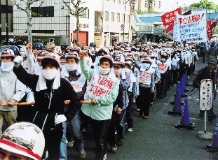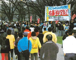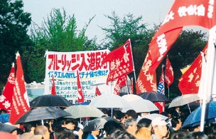 小泉政権は四月二十六日に、「武力攻撃事態法案」をはじめとする有事三法案を衆院本会議で審議入りさせた。戦闘的労学は、アメリカ帝国主義・ブッシュ政権によるイラク・中東への侵略戦争に積極的に参戦するための有事法の制定にしゃにむに突進する小泉政権にたいして、一大反撃の痛打を浴びせたのである。 小泉政権の一大攻撃をまえにして、無力な対応に終始している社・共既成指導部を弾劾し、その翼下の既成反対運動をのりこえるかたちで、首都圏のたたかう労働者・学生は、全国の闘いの最先頭で4・28国会包囲闘争をたたかいぬいたのだ。アメリカ・ブッシュ政権の「対テロ戦争」やイスラエル・シャロン政権の暴虐にたいして、中東をはじめ全世界で抗議に起ちあがった労働者・人民と連帯しつつ。 |