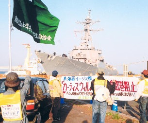 | 米艦船の民間港寄港に反撃 アメリカ帝国主義ブッシュ政権は、日本各地の民間港を「対テロ戦争」の出撃・兵站・補給拠点としてフルに活用することをたくらんでいる。このたくらみにもとづいて、日本政府の全面協力のもとに各地の民間港に米軍艦船を次々に寄港させている。