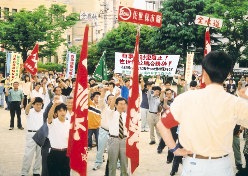 わが同盟は、このような労学の闘いに呼応して、独自にビラまきなどをつうじて、社共既成指導部が有事法反対闘争を院内四野党共闘の尻押し運動に歪曲しようとしていることを声を大にして暴きだし、議会主義的歪曲をのりこえて<有事立法粉砕・小泉政権打倒>の一大闘争をつくりだすべきことを鮮明にさししめしたのである。 すべての労働者・学生諸君! 6・15―16闘争のきりひらいた地平をがっちりと踏みしめ、有事立法粉砕の闘いのさらなる前進をかちとろう! 以下、章見出し 労学市民が怒りの決起 闘う学生の集会・デモに共感広がる 日共中央の議会主義的歪曲に抗して――下からの共同行動の高揚 ブクロ派残党の潜り込み・挑発を許すな |