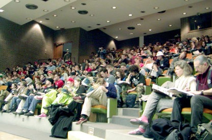 戦争狂(ブッシュ)≠フ足もとを揺るがす 全学連派遣団、全米各地で奮闘 CANの全国会議でスタンディング・オベーション 2・22―23シカゴ 「アメリカ帝国主義のイラク侵略戦争を阻止する闘いを、戦争狂ブッシュの足元から断固として創りだすぞ!」――飯田委員長を先頭とするわが全学連アメリカ現地闘争団は二月二十日、決意も固く成田空港を飛びたった。 最初の目的地はイリノイ州のシカゴ。到着した現地闘争団は、二月二十一日に現地の学生デモにただちに合流。この場において、飯田全学連委員長が発言にたつ。「日本の政府は、米軍を支援するために自衛隊をアラビア海に派遣した。この策動をとめることが私たち日本の学生の責務だと思っている。太平洋を越える連帯の力で、イラクへの侵略戦争を阻止しよう!」と満身の力を込めて呼びかけた。これを号砲にして、アメリカ現地闘争団の闘いは始まったのだ。