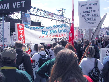 | 今こそ全世界労働者人民の〈反戦〉の嵐で戦争屋どもを包囲し打ち倒せ! ワシントンに全学連旗翻る 「ブッシュを倒せ!」派遣団が奮闘 3・15 わが全学連アメリカ現地闘争団は、ついにヤンキー帝国主義権力者の中枢=ホワイトハウスの眼前で、真紅の全学連旗を翻した! 三月十五日、「インターナショナルANSWER連合」などの呼びかけのもと、「NO WAR ON IRAQ!」を一致点としたホワイトハウス大包囲行動に全米から結集した十万人にのぼるアメリカの労働者・人民が決起した。われわれ闘争団は、彼らと合流し固く団結しつつ、「アメリカ帝国主義のイラク侵略戦争反対!」を掲げて、戦争狂=ブッシュの眼前で革命的反戦闘争の炎を高だかと吹きあげたのだ。