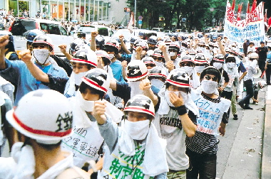 有事法参院採決強行に抗議する緊急沖縄県民集会に労組員・学生600名が結集 (6月6日、那覇市県庁前広場) |