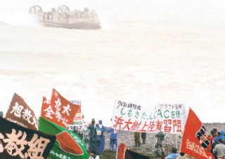 a)「上陸演習阻止!」LCACにシュプレヒコールを叩きつける闘う労働者・学生(7月11日、浜大樹) |