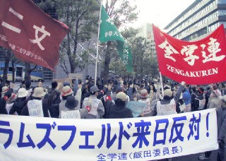 11月14日、米国防長官ラムズフェルド来日にたいして、全学連のたたかう学生は、東京・赤坂のアメリカ大使館前で抗議闘争に起ちあがった。「イラク軍事占領反対! 自衛隊のイラク派遣阻止!」を掲げ戦闘的にたたかいぬいた。 |