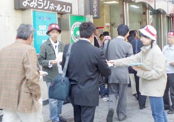 わが同盟のビラを集会参加者に元気よく配布する情宣隊 |