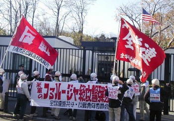 労学が抗議行動 11・14札幌 十一月十四日、反戦青年委員会の労働者と全学連道共闘の学生は、米軍のファルージャ総攻撃・イラク人民大虐殺への怒りに燃えて、在札幌アメリカ総領事館にたいする抗議闘争に断固として決起した。 |