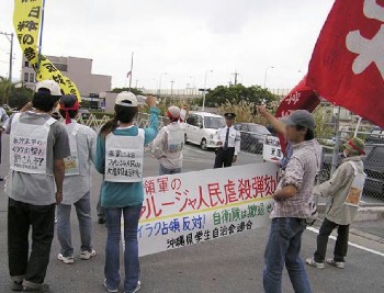 11・9 浦添 十一月九日、琉大と沖国大のたたかう学生たちは、浦添市にあるアメリカ総領事館前に勇姿をあらわし「米占領軍によるファルージャ人民大虐殺弾劾!」と大書きした横断幕を通路いっぱいに張り、ただちにシュプレヒコールを浴びせかけた。 |