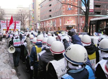 12・12 労学200が札幌で戦闘的デモ ファルージャ虐殺弾劾! 反安保の火柱 〇四年十二月十二日、全学連北海道地方共闘会議と反戦青年委員会は、<米軍のファルージャ人民大虐殺弾劾! 日本国軍の派兵期間延長弾劾!>を掲げて、全道労働者・学生統一行動に勇躍決起した。札幌駅前通りを力強く前進する北海道の労働者・学生 |