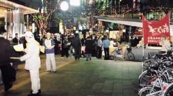 11・25名古屋 愛知県民集会で大情宣 日共系労働者に共感広がる わが同盟の情宣部隊は、名古屋市の中心街・栄三越前においても、「米軍のファルージャ大虐殺弾劾! 日本国軍はイラクから撤退せよ!」と道行く人びとに呼びかけ、大情宣をくりひろげた。 |