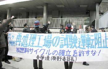 12・21 「六ヶ所村再処理工場の試験運転反対!」 全学連が経産省に抗議 「六ヶ所村再処理工場の試験運転阻止!」の横断幕を掲げ、全学連の学生たちは昨〇四年十二月二十一日午前十時五十分、経済産業省前に登場し「再処理工場の運転阻止!」「核燃料サイクルの確立を許さないぞ!」怒りの拳を叩きつけた。 |