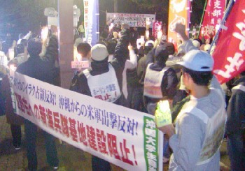 昨〇四年十二月二十日、二十一日の両日、琉球大・沖縄国際大のたたかう学生は、平和運動センターのもとでたたかう労働者や市民と固く連帯しつつ、那覇と名護において、辺野古への海兵隊新基地建設阻止の闘いに連続的に決起した。ブッシュ政権の米軍再編(トランスフォーメーション計画)への幻想を労働者・市民に煽り、これに依拠して「普天間基地の閉鎖」を求めるものへと闘いを歪めようとする社共既成指導部によって、危機を深める既成反対運動を下からつくりかえるために奮闘したのだ。 |