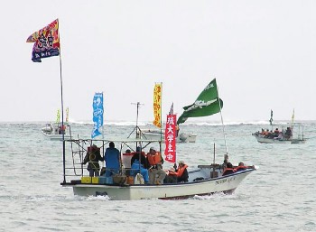 デモ船団の先頭で奮闘(04年12月21日、辺野古) |
