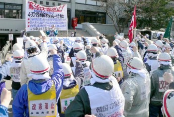 海外派兵のための「九条改憲」に踏み切った自治労本部弾劾! リード すべての自治体労働者のみなさん! とりわけ自治労の組合員のみなさん! 自治労本部はまさに今、「九条改憲」の方針を八月の鹿児島大会においてなにがなんでも決定する意志をむきだしにして、「護憲」を掲げている各県本部を恫喝してまわっている。日教組本部にたいしても、はやく護憲の旗を降ろせ!≠ニ圧力をかけている。「戦力を保持すること、そしてこの戦力を国際貢献に使うことを、憲法に明記せよ!」と叫んでいる「連合」会長・笹森――この輩に尻をたたかれて、自治労をはじめ旧総評系諸労組を、民主党の九条改憲案を支持する改憲推進大運動に組織していく先兵役をかってでているのが、自治労本部の右派ダラ幹どもなのだ! 憲法第九条を踏みにじってイラク派兵を強行してきた小泉政権が、戦争狂ブッシュのおしつけ≠ノ従って憲法改悪を一気に成し遂げようとしている今日このときに、自治労本部は「九条改憲」に踏みきり、改憲翼賛の旗を振っている。これを歴史的大罪と言わずして何と言うのか! すべての自治体労働者は、この世紀の大裏切りを怒りを込めて弾劾し、「戦争のできる国」への飛躍をたくらむ政府・支配階級の憲法改悪の大攻撃をうち砕くために、今こそともにたちあがろう!〔五月十日付の自治体労働者委員会のビラを掲載します。〕 自治労本部の歴史的大罪を弾劾せよ! 平和フォーラムの5・3「改憲集会」弾劾! 九条を否定し海外派兵を認める「平和基本法制定」方針を許すな! 本部のワナにはまった反本部派県本部の限界をのりこえて闘おう! 「自治体リストラ」の諸攻撃をはねかえそう! 〈改憲阻止・イラク反戦・反安保〉の闘いを! スローガン ◆「改憲」の旗を振る「連合」笹森執行部を弾劾し憲法改悪を断固阻止しよう! ◆海外派兵を認める「平和基本法制定」方針反対! ◆五月中央委員会・八月鹿児島大会での「九条改憲」方針の決定を絶対に阻止しよう! |
