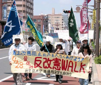4・28鹿大反改憲WALK 四月二十八日、鹿児島大学のたたかう学生たちは「4・28昼休み反改憲WALK」と銘うって学内集会と市街デモ行進をおこなった。ブッシュ政権の強力な要請を受けながら改憲に突き進む小泉政権にたいして、彼らは抗議の声をあげたのだ。騎射場商店街を元気よくデモ |
