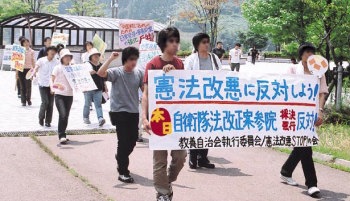 自衛隊法「改正」案の参院採決が強行されようとしていた七月二十日、金沢大学のたたかう学生たちは角間キャンパスにおいて「憲法改悪反対! 安保同盟の強化を許すな! 7・20金大生青空昼休み集会」を開催し学内デモ行進にたちあがった。 |