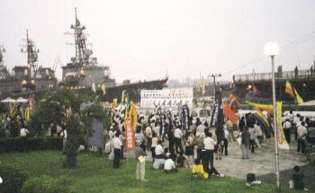 七月二十二日、愛労連傘下の労働組合を中心とする「憲法と平和を守る愛知の会」などの実行委員会が主催して、「海上自衛隊展示訓練反対 7・22名古屋港集会」が開催された。わが同盟の情宣隊は、集会前のデモ出発地点とされた港橋公園に結集する労組員に、そしてガーデン埠頭公園でおこなわれた本集会に参加する名古屋市民に、「海上自衛隊の『展示訓練』を許すな!」「日米軍事同盟の強化反対! 憲法改悪阻止!」とよびかけたビラを配布した。 |