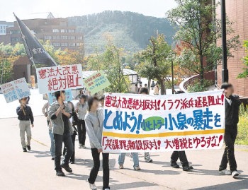 金沢大学のたたかう学生たちは「憲法大改悪と安保同盟の強化を許すな!」の決意にもえて、角間キャンパスにおいて「とめよう!小ヒトラー小泉の暴走を 10・21昼休み集会」を開催し、学内デモにたちあがった。 |