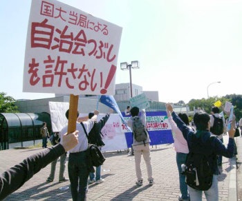 横浜国立大学のたたかう学生は、経済学部自治会を「存在が確認できない集団」などと烙印して自治会破壊の悪らつな意図をむきだしにした当局を弾劾し、サークル選別・管理のための「届出制」に反対する10・25対当局抗議行動を実現した。 |