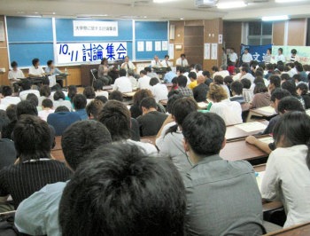 三〇〇名の学生が副学長を追及 十月十一日、鹿児島大学のたたかう学生たちは、鹿大当局による大学祭(鹿大祭)破壊攻撃をはねかえすために、学生自治団体と当局との「討論集会」を圧倒的に実現した。この場に約三〇〇名の学生を結集し、副学長をはじめとした当局者たちを断固として追及したのだ。 |