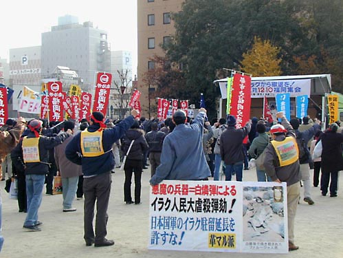 派兵延長弾劾の声高く(05年12・10、福岡市冷泉公園) 昨年十二月八日、小泉内閣は自衛隊のイラク派兵を一年間再延長することを閣議決定した。この暴挙にたいして怒りに燃えた福岡県下の労働者約一五〇〇名は、十二月十日、「平和・人権・環境福岡県フォーラム」主催の「自衛隊はイラクから撤退を! 派兵再延長反対! 12・10福岡集会」に結集し、抗議のデモンストレーションを展開した。わが同盟の情宣隊は、日本共産党の「反安保」なき「護憲」運動をのりこえて断固としてたたかうべきことを、結集した労働者に訴えて戦闘的にたたかいぬいた。 |