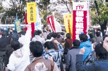 〇五年十二月三日、福岡市警固公園において、「連合福岡」主催の「サラリーマン大増税阻止総決起集会」が組合員一五〇〇名を結集して開催された。わが革命的・戦闘的労働者たちは、職場深部からこの闘いの高揚をつくりだすために奮闘した。 わが同盟の情宣部隊は、「サラリーマン増税・消費税税率引き上げ絶対反対!」「公務員の大量削減・大幅賃下げを許すな!」と刷りこんだビラを結集してくる組合員にくまなく手渡した。 |