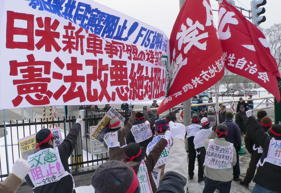 3・4千歳 米軍F15訓練移転阻止の炎 道共闘が七〇〇名の労働者と連帯 空自千歳基地にシュプレヒコールを叩きつける学生たち |