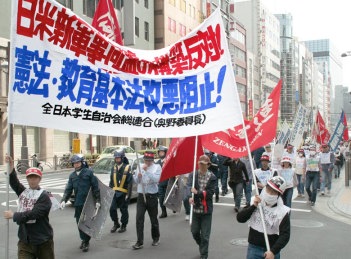 教基法改悪を絶対に阻止せよ! わが同盟は、すべての労働者・学生諸君に訴える。国会に上程された教育基本法改定案の採決・成立を阻止するために総力をあげて奮闘せよ! 四月二十八日、ついに小泉内閣は、自民党・公明党の与党合意にもとづく教基法改定案――「我が国と郷土を愛する態度を養う」ことを明記し、能力主義教育や教育の国家統制の強化を盛りこんだもの――を閣議決定し、ただちに国会に上程した。「会期延長しない」と宣言している小泉政権は、六月十八日の会期末までに教基法改定案を成立させるために、衆院に特別委員会を設置することを決定した。わずか一ヵ月余の国会審議をもって、改定案を成立させようとしているのだ。 これにたいして日教組本部は、ようやくうちだした「教育の危機宣言」において与党協議の密室性≠もっぱら非難し、「慎重かつ時間をかけて国民的議論をおこなうよう」求めているにすぎない。そもそもこのかん、「ただちに『教育危機宣言』を発して反対運動にとりくめ!」という戦闘的・良心的組合員の声を無視して、「改正論議」を尻押しするものでしかない「教育基本法調査会」設置要求署名を組合員に強要してきたのが、日教組本部だ。愛国心教育の明記についても「『国を愛する態度』は無理矢理教え込むのではなく、子どもたちが自然に身につけるものではないでしょうか」と政府・与党に弱々しく訴えているにすぎない。「文科省とのパートナーシップ」を標榜して、教基法改定案において正当化されている小泉式「教育改革」の施策の実現に協力しているのが日教組本部だ。彼らには、教基法改悪に反対するパトスもイデオロギー的拠点もまったくないのだ。 すべての諸君! われわれは、国家主義的・能力主義的な「教育改革」をすすめるための教基法の改悪を阻止する闘いを、日教組本部による「教基法を学び生かす」をシンボルとした「慎重審議」要求運動への歪曲や、全教本部による議会主義的闘争歪曲をのりこえ、<ネオ・ファシズム的教育再編反対>の方向性を鮮明にしてたたかおう!「日の丸・君が代」強制などの愛国心教育や能力主義教育、様々な労務管理の強化に反対することを任務としてたたかおう! 教基法改悪がブッシュおしつけ改憲の先取りであることを暴きだし、<「戦争をやれる国」づくり反対>を結び目とし、教基法改悪阻止闘争を<憲法改悪阻止! 日米新軍事同盟構築阻止!>の反改憲・反戦反安保の闘いと結合してたたかおう! 教育労働者を先頭にして、すべての労働者・学生は、職場・学園から教基法改悪阻止闘争を断固として推進せよ! (四月二十八日) |