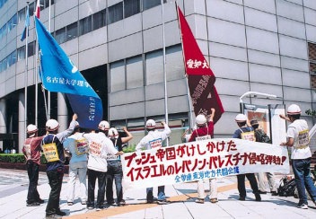 八月十五日、全学連東海地方共闘会議の学生は、ブッシュ政権がけしかけたイスラエルのレバノン・パレスチナ軍事侵略を弾劾するために名古屋市のアメリカ領事館への抗議行動に断固決起した。 |