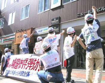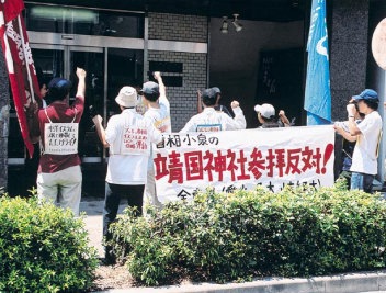 全学連東海地方共闘会議の学生は、八月十五日、首相・小泉が靖国神社への公式参拝を強行したことにたいして、ただちに自民党愛知県連への断固たる弾劾の闘いに決起した。 |