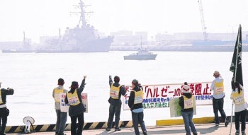 「米イージス艦寄港阻止!」 「ハルゼー」を迎え撃つ鹿大生(11月2日、鹿児島谷山港)) |