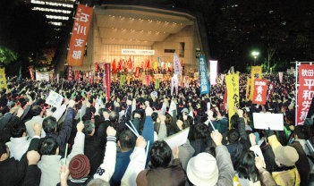 教基法改悪阻止の決意も固く全国から結集した教育労働者 (12月8日、日比谷野音) |