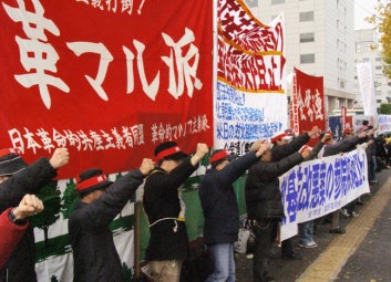 敗残ブクロ派に最後の止どめを刺せ! 中野一派によるブクロ派自己解体≠フ宣言 わが同盟は、国家権力の走狗ブクロ=中核派の残党に最後の止どめを刺すために、「党の革命」の名のもとに中野洋一派が仕組んだクーデタ≠フ実態とそれにかけた彼らの薄汚ない思惑、延命策の本質を断固として全社会的に暴きだした(本紙第一九四五号)。わが同盟が敢然とおしすすめてきた権力の謀略粉砕・走狗集団解体の闘いに追いつめられ、すでに五年も前に降参の白旗を掲げながらも、残存ブクロ官僚どもが表向きは掲げつづけてきた「革共同」という党名=B血に汚れた国家権力の走狗=スパイ集団の代名詞として周(あまね)く知られたこの「革共同」という党名を最後的に捨て去るために、すなわち「労働者党」という名のハミダシ労働運動活動家集団へとブクロ派残党を最後的に再編=純化≠キる陰謀を完了するために、中野一派は己れにたてつく残存官僚どもおよび手配師どもを粛清し党外に追放した(今〇六年九月)。これぞ、中野一派による「党の革命」なるものの薄汚ない本質にほかならない、と。 わが同盟が満を持してブクロ派に撃ちこんだこの暴露の巨弾に、中野一派は度肝を抜かれた。来るべきものが来た≠ニいう絶望的心境に陥った彼らは、ことここに至って、ついにケツをまくった。彼らは、スパイ通信こと『前進』第二二七三号五面の片隅に「革共同第二十二回拡大全国委総会」なるものの「報告」記事にことよせて、「党の革命」なるものの内実を自己暴露したのだ。「党そのものを内部から、しかも中枢から解体するという最大の歴史的危機を、労働者党員の決死の実力決起によってうち破った」と。これぞまさしく、中野一派による残存ブクロ派の自己解体宣言にほかならない。わが同盟の追撃から身をかわすために、「革共同」という組織名を捨て去り「労働者党」という名称に付け替えるという思惑を、あからさまに表白したものなのである。 だが、中野一派よ。こんなケチ臭い所業をもって、わが同盟がお前たちを許そうはずがないではないか。敗残中野一派が「労働運動路線」の名のもとにハミダシ「労組活動家」集団として生き延びることなど、われわれは絶対に許しはしない。最後の最後まで解体しつくすことを、ここに宣告する。 以下、見出し 「党の革命」の名による党名&マ更の企み 「党中央」崩壊と全組織的分解の惨状 「労働運動」潜りこみの策動を粉砕せよ |