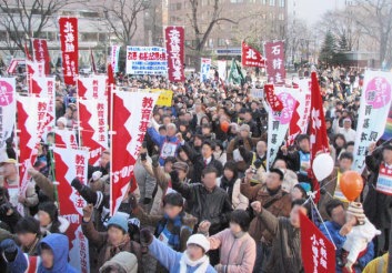 十一月二十五日、「教育基本法改悪法案を廃案にしよう! 全道一万人集会」(主催 教育基本法の改悪を止めよう! 北海道連絡会)が開催された。北教組や全教の組合員をはじめとする全道の労働者・学生・市民一万名が、安倍政権・与党による参議院での採決・成立を絶対に阻止するという決意を固めて札幌大通り公園西八丁目広場に結集し、市内デモに起ちあがった。 |