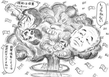 「謝罪するならしゃべるな」、「久間は選挙期間中は土下座行脚すべきだ」(参院議員・舛添)……。自民・公明の政治エリートたちはいよいよ参院選での大敗という悪夢におそわれヒステリー化。久間の後任に小池百合子(首相補佐官)を泥縄的に起用しイメージアップをはかろうとしたものの、焼け石に水。そもそも、この女はその時々の権力者や実力者に、とっかえ引っかえとりいってきた牝狐(メギツネ)。化けるだけがとりえ。皇居での認証式の時は紺のドレス、次の自衛隊観兵式では黒いドレス。でも、「国際情勢によっては日本も核武装すべき」と語ったこともある小池。ドレスの下からシッポが見えている。 久間発言につづいて米政府特使ジョセフ某が言い放った暴言――「原爆が終戦をもたらし、何百万人もの日本人の命を救った」(七月三日)。これにたいして小池は「アクション? 今のところありません」と当然にも容認。 これまで「女は産む機械」の厚労相・柳沢をかばい、「ナントカ還元水」の前農水相・松岡をも最後までかばいつづけた安倍は、今回も例によって「彼は米国の考えを紹介しただけ」などと久間を弁護し、野党の非難にたいしても久間への「厳重注意」をもってお茶を濁そうとした。けれども、党内から辞任論が噴出しただけではなく、頼みの綱の公明党からも見切りをつけられてしまった。こうなってはもはやどうしようもない。辞任以外に道はなし。すっかり脱力した様をさらしていたのが安倍だ。 「安倍君が任命した人なんだ、結局そこに行き着く」と、明確に安倍を非難したのは参院自民党のドンでありX0グループ=現津島派の領袖である青木幹雄。そもそも青木は、自分の反対をおしきって安倍が公務員制度改革関連法などを制定すると称して参院会期を延長したことについて、怒り心頭に発していた。そんなことをすれば逆に国民の反発を買ってしまうと焦ったのだ。専横を極めるX1=町村派政治エリート主導の安倍内閣をゆさぶるために、青木は久間発言を利用して安倍非難のトーンを強めている。久間の辞任によって津島派の閣僚がついに一人もいなくなった内閣などは、とっととひきずりおろしてしまえというわけだ。そもそも久間のかの発言じたいが、X1主導の安倍執行部へのゆさぶりの意図がこめられていたのではないのか。 久間発言・辞任をもインパクトとしてますます激化する権力抗争にゆさぶられ、安倍内閣はもはや沈没寸前の泥舟と化している。久間問題につづいてさらに農水相・赤城の事務所経費の架空計上が発覚。開き直った安倍は赤城を留任させることを言明。破れかぶれの心情をニタニタ顔でおし隠す。参院選で負けたって衆院があるさ、と……。 六〇年安保のさいにジジイ岸信介邸をデモ隊が連日とりまいたときに、満五歳にして水鉄砲でデモ隊に反撃したと自慢≠キるボンボン安倍。この男はもちろん、「アメリカが原爆を落としたおかげで日本はソ連に占領されないで済んだ」という久間発言の内容に違和感など抱いていない。「自由の拡大」のためには核兵器の使用も当然とするブッシュ政権の論理をオウム返しにした久間の発言は、いままさに日本をアメリカとともに<戦争をやれる国>に飛躍させることを狙う日本版ネオコン安倍政権の本音をあらわしている。安倍じしんも、「核兵器使用は合憲」(二〇〇二年四月、早稲田大学での講演)を持論としているのではないか。 進退窮まりながらも破れかぶれで<戦争をやれる国>づくりに突進する安倍政権をぶっとばせ。 |