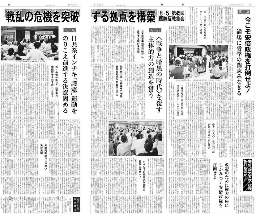 安倍権力妄執$ュ権を打ち倒せ! 憲法改悪阻止! 日米新軍事同盟強化反対! 首相官邸・国会包囲―九月闘争に決起せよ 八月二十七日おこなった内閣改造において安倍は、高村(防衛相)、町村(外相)、伊吹(文科相)ら各派閥の領袖を重要閣僚にすえるかたちで「挙党態勢づくり」を演出した。自民党三役人事においては、参院選後いち早く「安倍続投支持」を表明した麻生太郎を幹事長に、二階俊博を総務会長にすえたことをはじめとして、「反安倍」の動きを封じこめることに躍起になっている。 こうした安倍の延命策にたいして、野党のみならず自民党内からも、「お友だち内閣≠ゥらは脱したが、旧態依然たる各派閥気くばり人事」という不満の声が噴きあがっている。参院選における歴史的大敗北にもかかわらず、政権の座にしがみつき続投≠決めこんでいるボンクラ安倍にたいして、自民党内の反主流派から安倍おろし≠フ気運がいっそう噴出するにちがいない。このゆえに、安倍政権は、臨時国会の幕開けを前にしてすでに命脈を断たれているのだ。しかも、ご主人様≠スるブッシュ帝国じたいが、イラクおよびアフガニスタンでの「対テロ戦」の破産に見舞われるとともに、胡錦濤中国とプーチン・ロシアによる反米国際包囲網の拡大・強化に揺さぶられており、ますます没落を露わにしている。こうした国際情勢の新たな激動に追い討ちをかけられ対応不能を露呈しているのが、ガタガタ安倍政権なのである。 それにもかかわらずこの政権の首班たる安倍晋三は、「『対テロ戦争』への参戦を継続せよ」というブッシュ帝国の下命を受けてテロ対策特措法(十一月一日期限切れ)の期限延長をなんとしてもなし遂げるために、そしてなによりも憲法改定という宿願を「五年以内」にみずからの手でなし遂げるために、なおも政権の座にしがみついている。 すべての労働者・学生諸君! 今こそわれわれは、安倍政権によるこうした一切の極反動攻撃を打ち砕く闘いに勇躍決起するのでなければならない。参院選において安倍自民党の敵失≠フゆえに勝利を収めた小沢の民主党にたいして、いまや既成反対運動の指導部はこぞって幻想を煽りたてている。だが、民主党・小沢がテロ対策特措法の延長に反対を唱え参院で否決する構えを誇示しているのは、何よりも安倍政権を退陣に追いこむためにこの政権の対米盲従ぶり≠浮きたたせるという政治的思惑にもとづく。この小沢の民主党にすがりついているのが、「政使労協議」方式の定着化を追い求める「連合」指導部や、「保守層との共同」願望に耽っている日共中央なのであって、われわれはこれを労働者階級の名において弾劾するのでなければならない。とりわけ、議会政党としての消滅の危機の乗りきりをかけて、議会内での民主党との「野党共闘」を磯のアワビ的に追い求めている日共の不破=志位指導部の犯罪性を満天下に暴露するのでなければならない。 今こそたたかう労働者・学生は、決起せよ。参院選の大敗北を居直りいまなお日本の労働者・人民・学生を<戦争と暗黒支配>のもとに組みしき、労働者階級を<絶対的窮乏化>のドン底に叩きこもうとしているボロボロ安倍政権を打倒する闘いの先頭に起て! 全学連の学生は、九月臨時国会開催日に首相官邸・国会包囲闘争に勇躍決起せよ! (以下、各章の見出し) 激化する米―中露の軍事的角逐 イラク・中東制覇の最後的破産に叩きこまれたブッシュ帝国 命脈尽きて迷走する安倍ボロボロ政権 改憲のために権力の座にしがみつく安倍政権を打倒せよ |