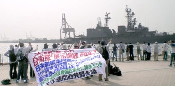自衛艦に怒りのシュプレヒコール (8月4日、大阪港天保山岸壁) |