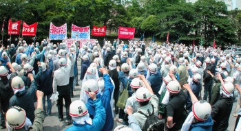 支持率一〇%台にまで低下している福田政権は、みずからの政治生命をかけて、G8サミットを成功的≠ノ実現することに血眼となっている。ついに福田政権は、六月十七日に「(消費税税率の引き上げを)決断しなくてはいけない」とぶちあげた。この極反動政権は、己の政権のうちに消費税大増税への道を「税制改革大綱」の決定というかたちで切り開く意志をむきだしにしているのだ。こうした大衆収奪強化の攻撃の刃を労働者・人民の頭上に振りおろすとともに、彼らは、ブッシュ政権に全面的につきしたがい、MDシステムの日本全土への配備を着々とおしすすめるのみならずアフガニスタンへの地上部隊の派遣をも企んでいる。 今日このときに、「連合」高木指導部は、日本全土へのMDシステムの配備や消費税増税の攻撃にたいして、そしてさらにはG8サミットにたいしても、なんら大衆的な反対の闘いを展開していない。日共中央が票田開拓のためにとりくんでいる「基地強化反対」や「消費税増税反対」の「たたかい」なるものにしても、その内実は「保守層との共同」を自己目的化し、「反安保」も「反独占」も一切合財投げ捨てたしろものにすぎないのだ。 こうした既成指導部の腐敗を弾劾しつつ、首都圏を中心とした闘う労学は、6・15闘争に断固として起ちあがったのである。 |