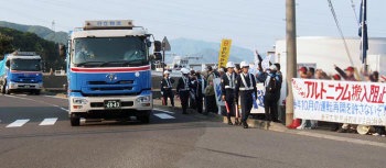 「原発反対福井県民会議」の労働者とともにMOX燃料の搬入を弾劾する金大生 (「もんじゅ」ゲート前) |