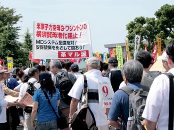 7・19平和フォーラム系全国集会 闘う労働者が横須賀現地で奮闘 しゃく熱の太陽が照りつける七月十九日、神奈川県横須賀に「G・ワシントン横須賀配備反対!」の声が響きわたった。「原子力空母の横須賀母港化を許さない7・19全国集会」の会場である横須賀市ヴェルニー公園に、北は北海道から南は九州・沖縄まで、全国から「平和フォーラム」や「平和運動センター」傘下の労組員を中心とする労働者・市民が結集した。わが同盟の旗のもとにたたかう革命的・戦闘的労働者たちは、「原子力空母の安全審査」要求や「日米地位協定改正」要求へと闘いを収斂する平和フォーラム指導部を左翼的・戦闘的に下から突きあげ、集会の戦闘的高揚をかちとるために奮闘した。わが同盟の情宣隊は、たたかう労働者とあい呼応しつつ、「反安保の旗高くたたかおう」と全参加者に熱烈に訴えたのである。 |