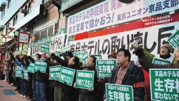強制執行に抗議して闘う京品支部と支援の労働者たち(1月25日、京品ホテル前―上・下とも) |