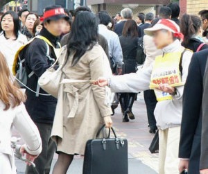 | 三月二十七日朝、「反戦」「団結」と染めぬいた赤ハチマキと「麻生臨死$ュ権打倒!」のゼッケンを身につけたわが同盟の情宣部隊が博多駅前で「麻生政権を打倒せよ!」と訴えたビラを出勤途上の労働者・人民に手渡し、大々的に情宣をくりひろげた。 | |
